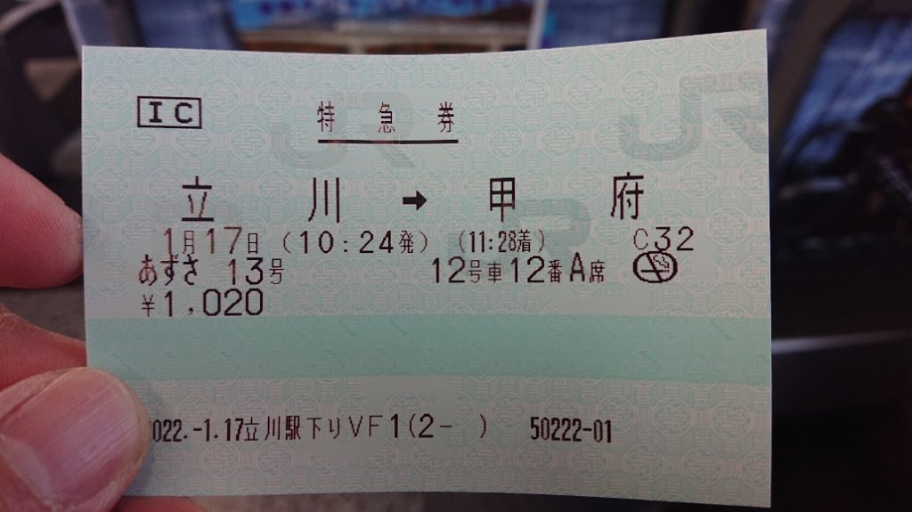 とりあえず立川まで出て、そこから特急列車あずさ23号に乗り、行き先の途中にあった甲府駅で下車する。